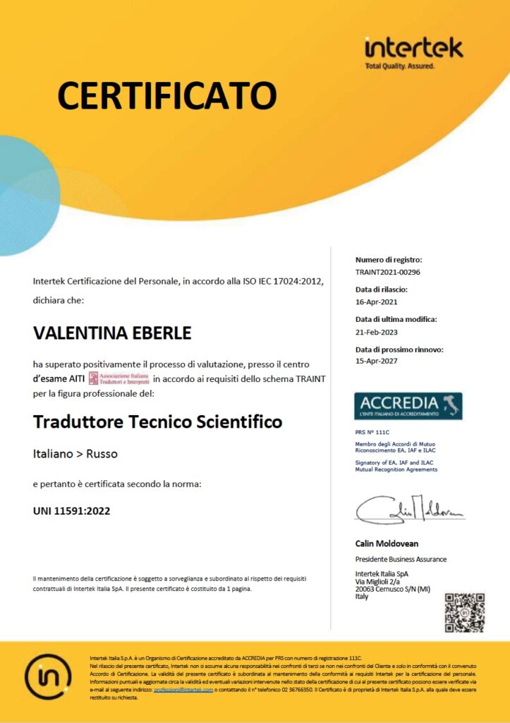 Dal 2016 opero come interprete nel settore farmaceutico nell’ambito di ispezioni regolatorie GMP e GVP presso siti produttivi italiani e internazionali (Russia, Bielorussia, Kazakhstan, Armenia, EAEU).